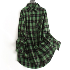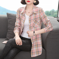 外搭格子衬衫长袖纯棉中长款翻领外套女春秋薄款2023新款大码开衫