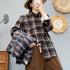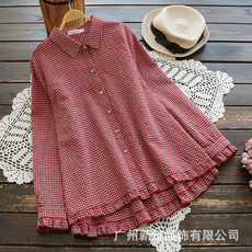 2022新款大码秋季女装日式棉麻荷叶边格子翻领长袖衬衫衬衣上衣
