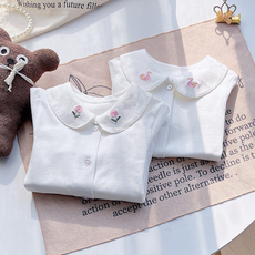 女童纯棉白衬衫春秋甜美刺绣翻领长袖T恤洋气儿童打底衫白色衬衣