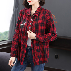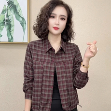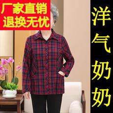 中老年纯棉格子衬衫女秋装妈妈装长袖翻领薄外套老太太全棉衬衣服