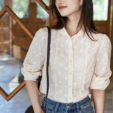 领子胸前重工刺绣双层棉纱长袖衬衫女圆翻领减龄绣花打底衬衣2666