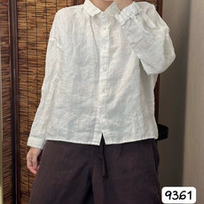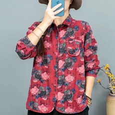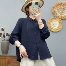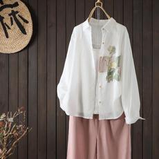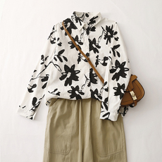 2025春夏新款苎麻文艺印花长袖衬衫女时尚宽松休闲百搭翻领衬衣