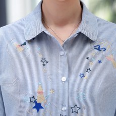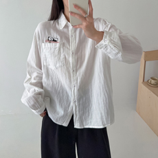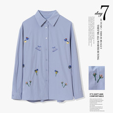 韩系主调宽松休闲衬衫女简约刺绣棉质长袖翻领显瘦