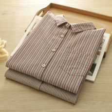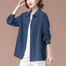 纯棉条纹衬衫女装中老年上衣春秋季宽松大码中年妈妈长袖遮肚翻领