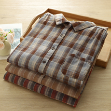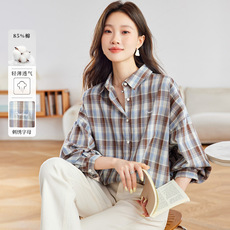 格子双层棉纱衬衫女宽松2025秋季韩范百搭纯棉柔软翻领长袖衬衣