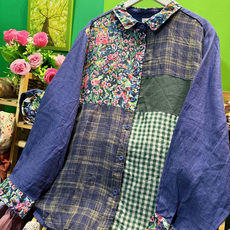 熊姑娘拼接衬衫/复古拼布棉麻2025春秋长袖宽松大码上衣女士翻领