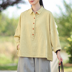 新中式复古棉麻衬衫女长袖翻领衬衣宽松文艺百搭茶服上衣太极服