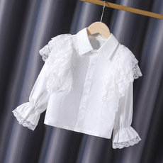 款女童长袖衬衫2025春秋新款女孩纯棉蕾丝肩翻领洋气公主上衣