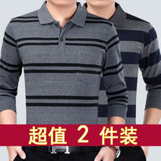 春秋季男装纯棉翻领条纹长袖t恤中老年男士POLO衫有领休闲打底衫