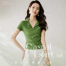 2024新款短袖t恤女夏季休闲百搭大码翻领显瘦简约运动纯色半袖衫