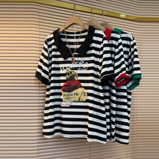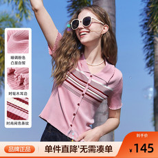 betu百图时尚木耳边翻领针织衫T恤女2025年夏季新款条纹毛线衣