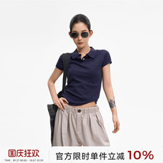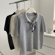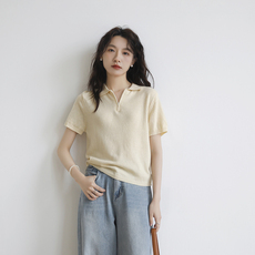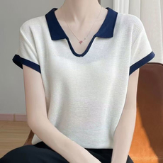 翻领撞色别致短袖针织衫女士夏季薄款小个子宽松遮肉显瘦t恤上衣