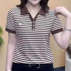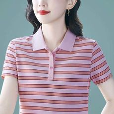 气质显瘦短袖t恤女夏季2025新款条纹polo衫妈妈宽松减龄翻领上衣