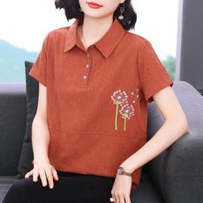 中老年女装夏季新款翻领印花短袖T恤气质显瘦妈妈装复古遮肚上衣