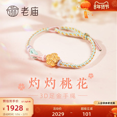 老庙黄金足金鎏彩花朵手绳5D精致时尚浪漫粉色俏皮可爱女生送礼