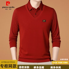 皮尔卡丹秋冬季假两件男士长袖衬衫领本命年红色中老年爸爸装打底