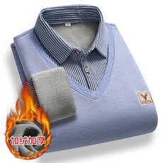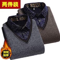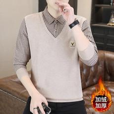 秋冬季假两件男衬衫长袖加绒加厚中老年花领爸爸打底衫帅气针织衫