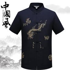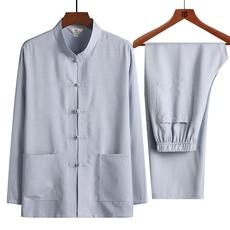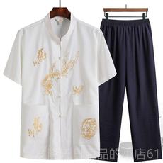 中老年唐装男爷爷夏装上衣舒适老年人中国风棉麻薄款长袖衬衫套装