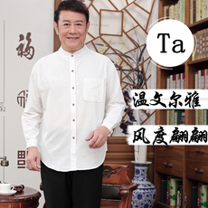春秋中年男士长袖全棉立领衬衫古风复古男圆领衬衫老年人气质衣服