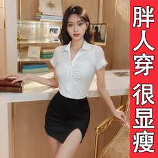 爆款Polo领衬衫女大码胖mm职业装性感衬衣开叉包臀裙OL风制服套装