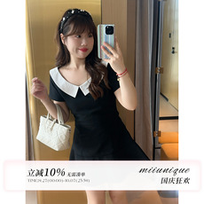 CLE**E新品可爱大码丰满胖妹mm日系拼色勾花娃娃领高腰黑色连衣裙