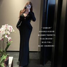大码女装胖mm法式黑色V领褶皱长袖连衣裙秋季气质收腰礼服长裙子
