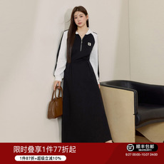 胖MM加肥拼色翻领长袖收腰连衣裙大码女装学院风减龄显瘦黑色裙子