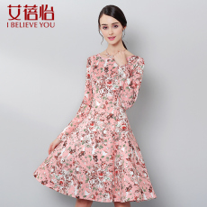 艾蓓怡2022春装新款女装修身圆领印花碎花大摆裙中裙长袖连衣裙女