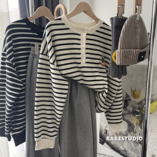 春新款刺绣徽章学院风条纹三排扣简约宽松休闲套头卫衣洋气韩系女