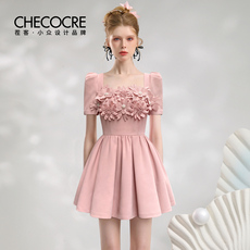 迟伞伞25/ss 山茶芭蕾 立体花朵蕾丝一字肩两穿收腰连衣裙短裙夏