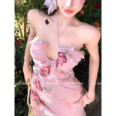 欧美ins时尚花朵印花抹胸连衣裙2024夏季新款辣妹修身包臀长裙 女