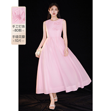 菲梦伊钉珠花朵连衣裙女夏装飘逸时尚轻薄设计感收腰显瘦百褶长裙
