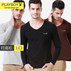 花花公子男装休闲修身上衣男士纯棉莱卡打底衫V领t恤男长袖紧身潮