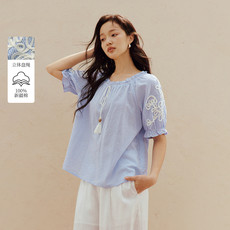 茵曼纯棉法式绣花条纹衬衫女2025夏季新款气质百搭舒适短袖衬衣