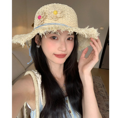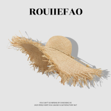 夏季女草帽新款毛边遮阳帽韩版大檐帽海边出游沙滩帽平顶DIY帽子