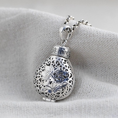 S925银双面镂空复古风莲花香囊吊坠可打开扩香薰项链福字嘎乌盒