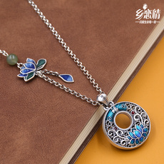 莲花平安扣9999纯银项链锁骨链景泰蓝吊坠复古女高档时尚520礼物