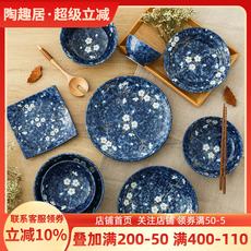 日本进口樱花釉下盘子餐盘平盘蓝色陶瓷家用日式餐具汤碗组合套装