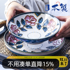 日本进口釉下彩陶瓷盘子彩绘蓝色繁花深盘圆盘日式餐盘悠游花钵碗