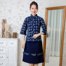 乌镇民族风蓝花布七分喇叭袖斜襟盘扣衬衫农家乐餐厅工作服演出服
