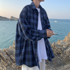 春夏男女情侣纯棉磨毛蓝白格子长袖衬衫休闲宽松防晒衣潮流男衬衣