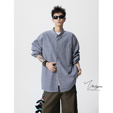 美式复古蓝色格子衬衫男秋季高级感痞帅长袖衬衣宽松百搭情侣外套