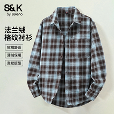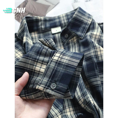美式蓝色格子衬衫男秋季高街潮牌青少年长袖衬衣复古百搭休闲外套