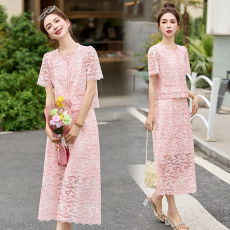 春夏新款百搭重工蕾丝刺绣小香开衫上衣+中长半身裙蕾丝时尚套装