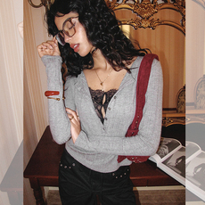 王楚然同款 Kroche 25aw 假两件蕾丝花边拼接 斜肩长袖针织衫打底