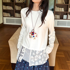 eihey诶嘿秋季美式复古长袖T恤打底衫中长款拼接蕾丝叠穿印花上衣