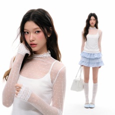 CyNi 设计感甜美少女感波点网纱打底衫半高领蕾丝弹力打底长袖T恤