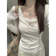 【TiTi美少女】韩版纯欲性感方领蕾丝衫长袖内搭御姐风轻熟打底衫