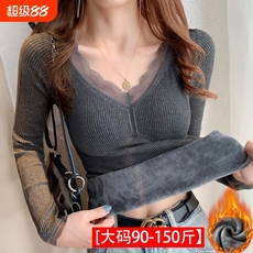 大码发热加绒上衣女秋冬季带胸垫保暖加厚长袖打底衫内衣服蕾丝边