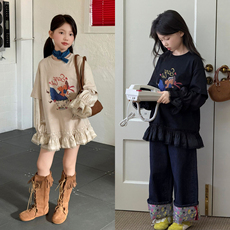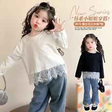 女童2025秋季新款蕾丝裙摆假两件T恤中大童女孩小个子上衣打底衫